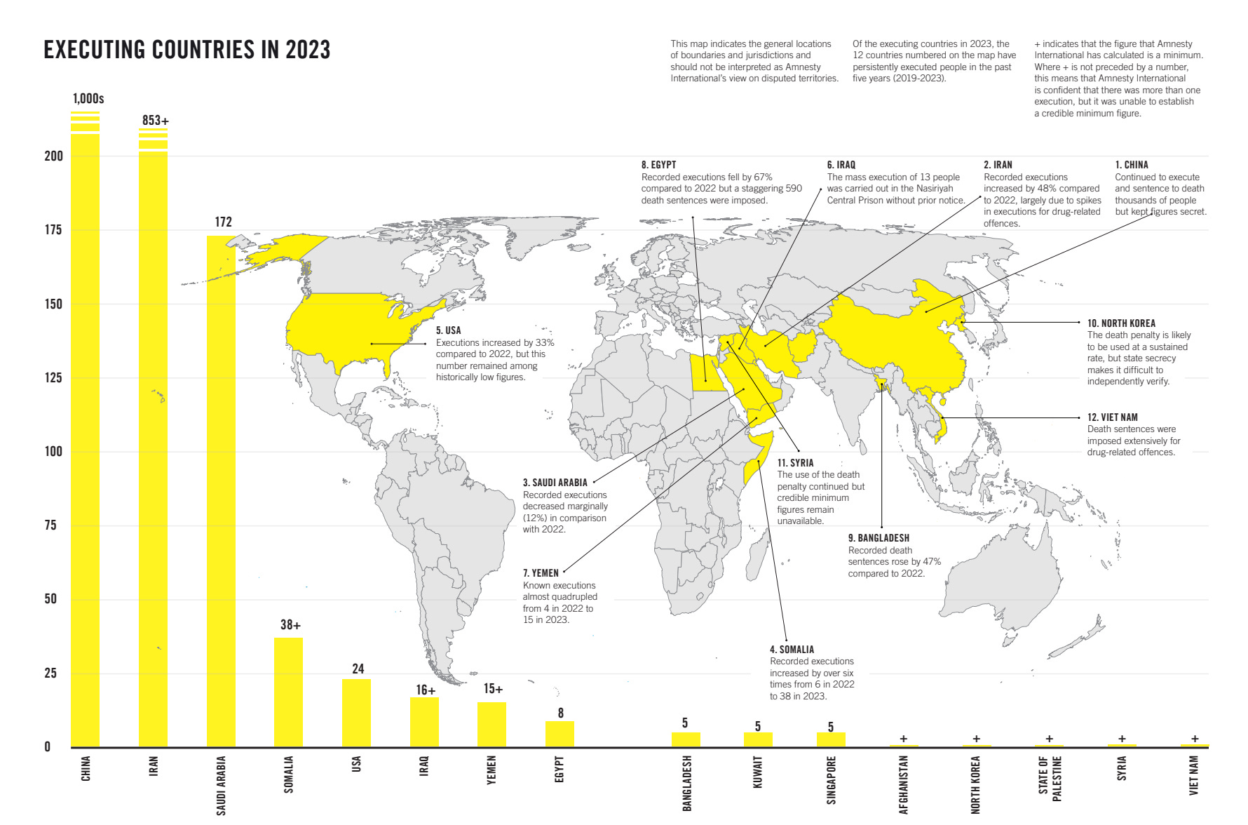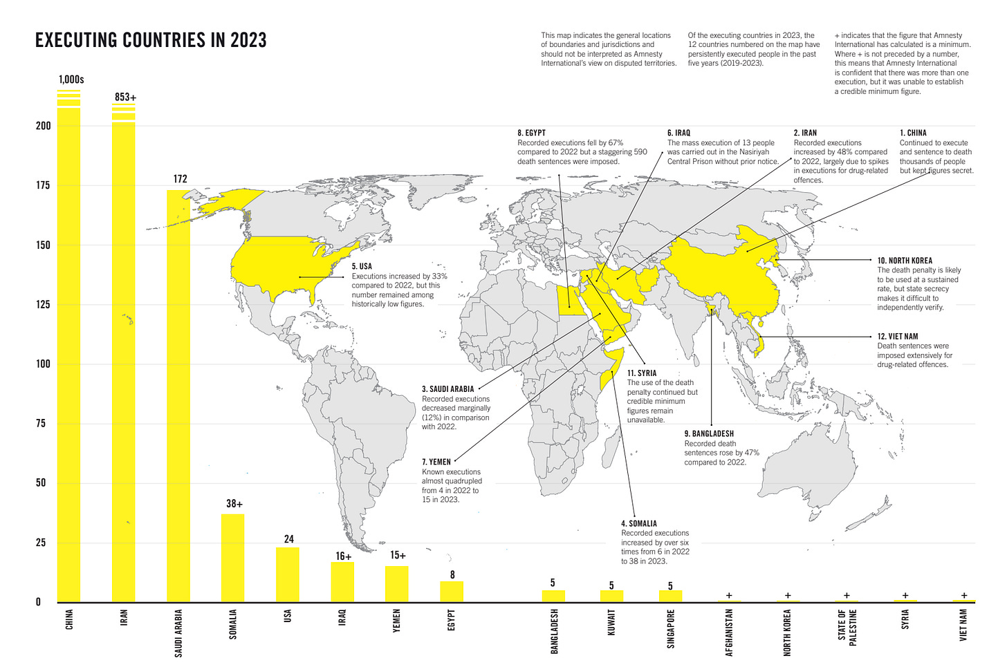 With 24 executions carried out in 2023, the U.S. ranked 5th in the world behind only China (1,000s), Iran (853+), Saudi Arabia (172) and Somalia (38+). That year, Oklahoma carried out four executions, amounting to a sixth of all executions in the U.S. in 2023.